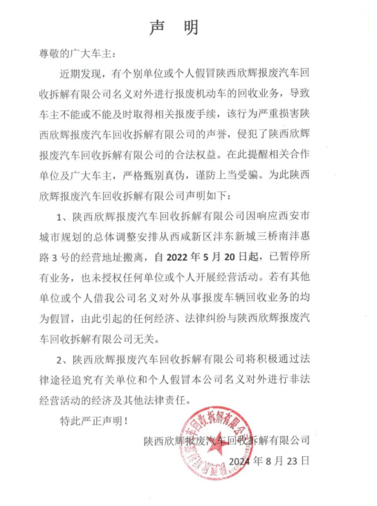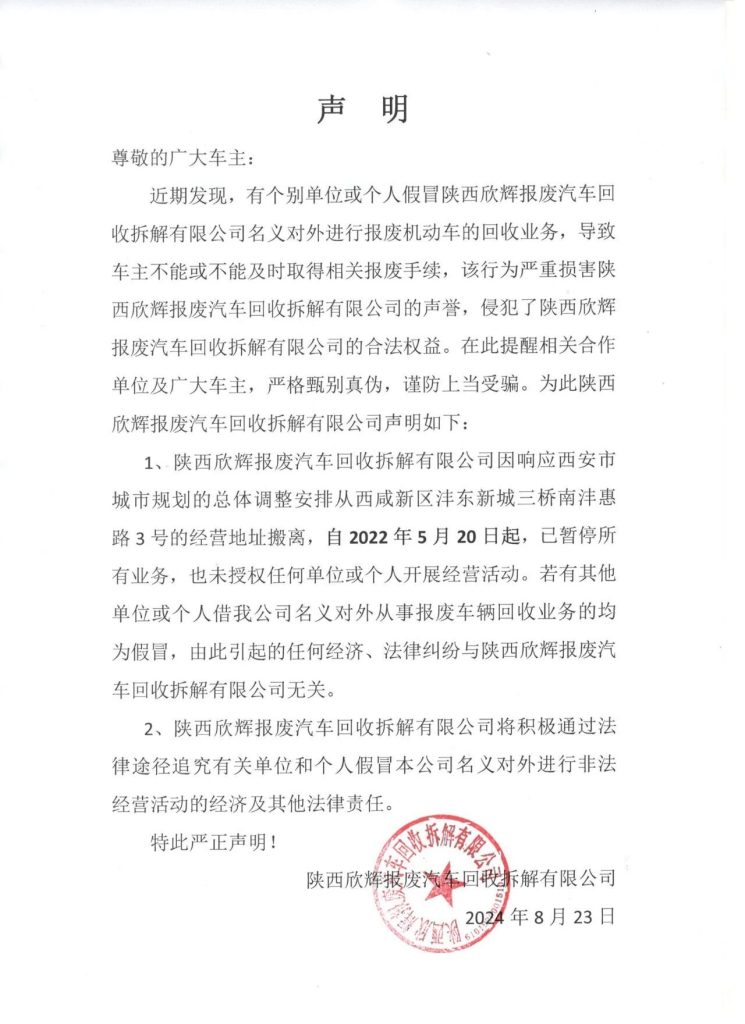 公司要闻 了解更多 声明 …阅读详情 2025年11月10日 国补政策10月最新消息,“国补”回复继续!要领取陕西国补汽车报废券,您需 …阅读详情 2025年10月16日 市商务局局长一行到欣辉公司检查指导工作2021年6月23日,西安市商 …阅读详情 2025年7月22日 业务范围 公司介绍 公司发展 成立初期 2018年 2019-2020年 2021年 荣誉成果 企业文化 服务理念 经营准则 管理理念 环保责任 创新驱动 诚信与责任 公司人员 陕西欣辉报废汽车回收拆解有限公司拥有一支专业高效、经验丰富的团队,涵盖管理、技术、环保、安全及运营等多个领域。 行业资讯 了解更多 报废汽车拆解行业:现状与前景展望 2025年7月24日 招标公告 了解更多 陕西欣辉报废汽车回收拆解有限公司2025年9月1日废钢、有色、废塑料招标公告 2025年7月24日 商品展示 选择一个类别 选择一个类别 全部商品 (4) 回用件 (3) 车灯 ¥100.00 远光灯 ¥90.00 商品2 ¥249.00 商品3 ¥115.00 商品4 ¥115.00 商品5 ¥125.00 回用件 ¥100.00